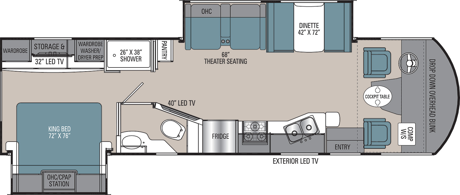 | Bed boven cabine (drop down) | 1,90 X 1,47 m (lengte X breedte) |